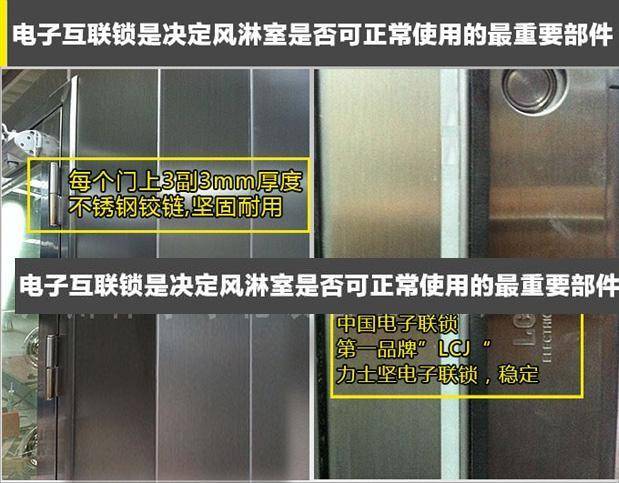 >>风淋室双门:材质为全不锈钢,上部带3C认证钢化玻璃视窗,下部为不锈钢平面处理,无凹凸棱角,减少死角;三道3MM厚度不锈钢铰链,保障门结实耐用,门与门框结合平整、牢固 、美观,密封性能良好,门开启灵活。